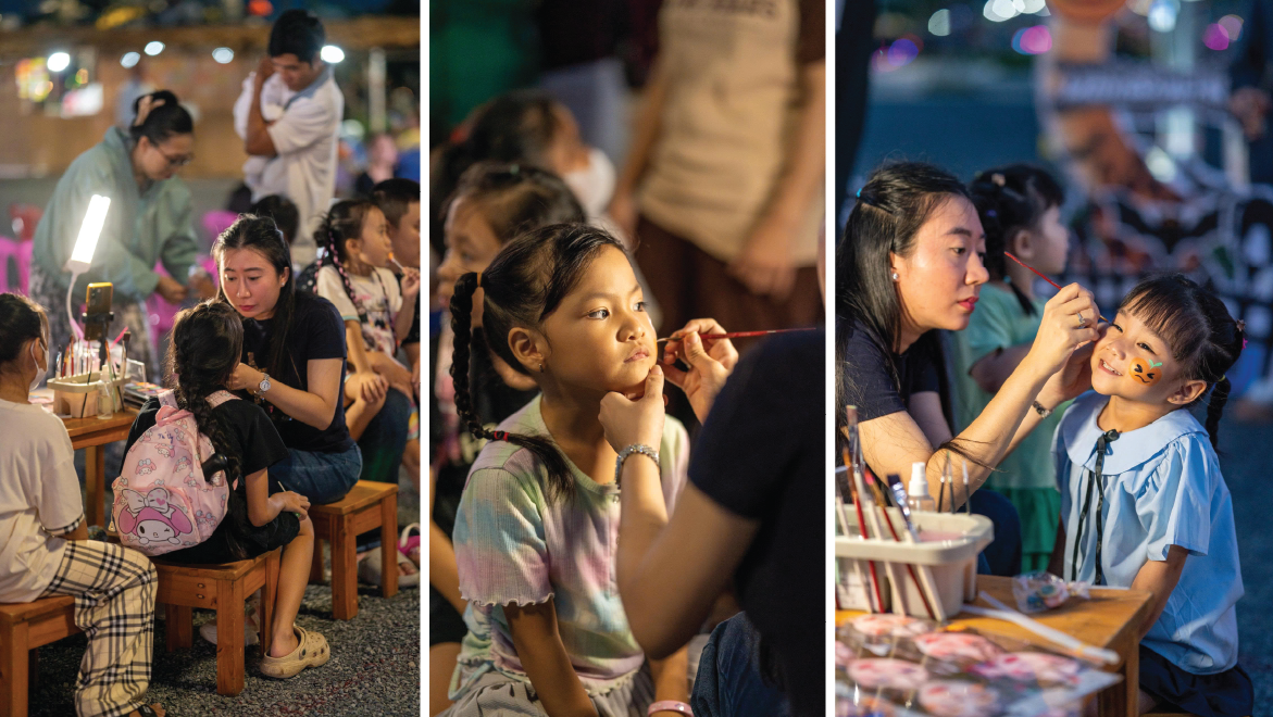 Gian hàng vẽ mặt miễn phí thu hút đông đảo các bé. Từng nét cọ khéo léo biến khuôn mặt thơ ngây thành mèo đen, chú dơi hay nàng phù thủy đáng yêu.